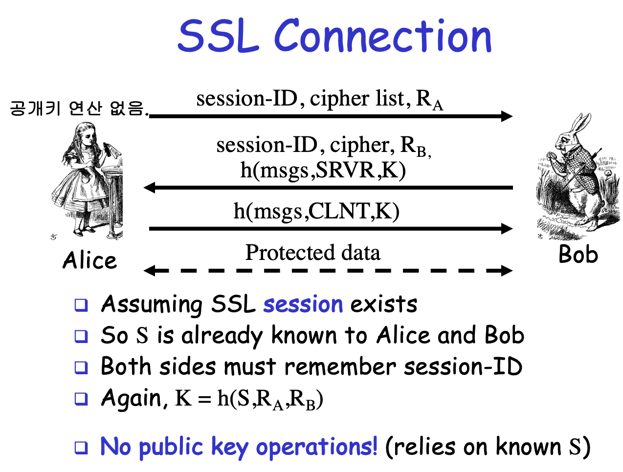 - 공개키 방식은 많은 컴퓨팅 파워를 사용한다. 만약 공개키를 그대로 사용하면 많은 접속이 몰리는 서버는 매우 큰 비용을 지불해야 한다.