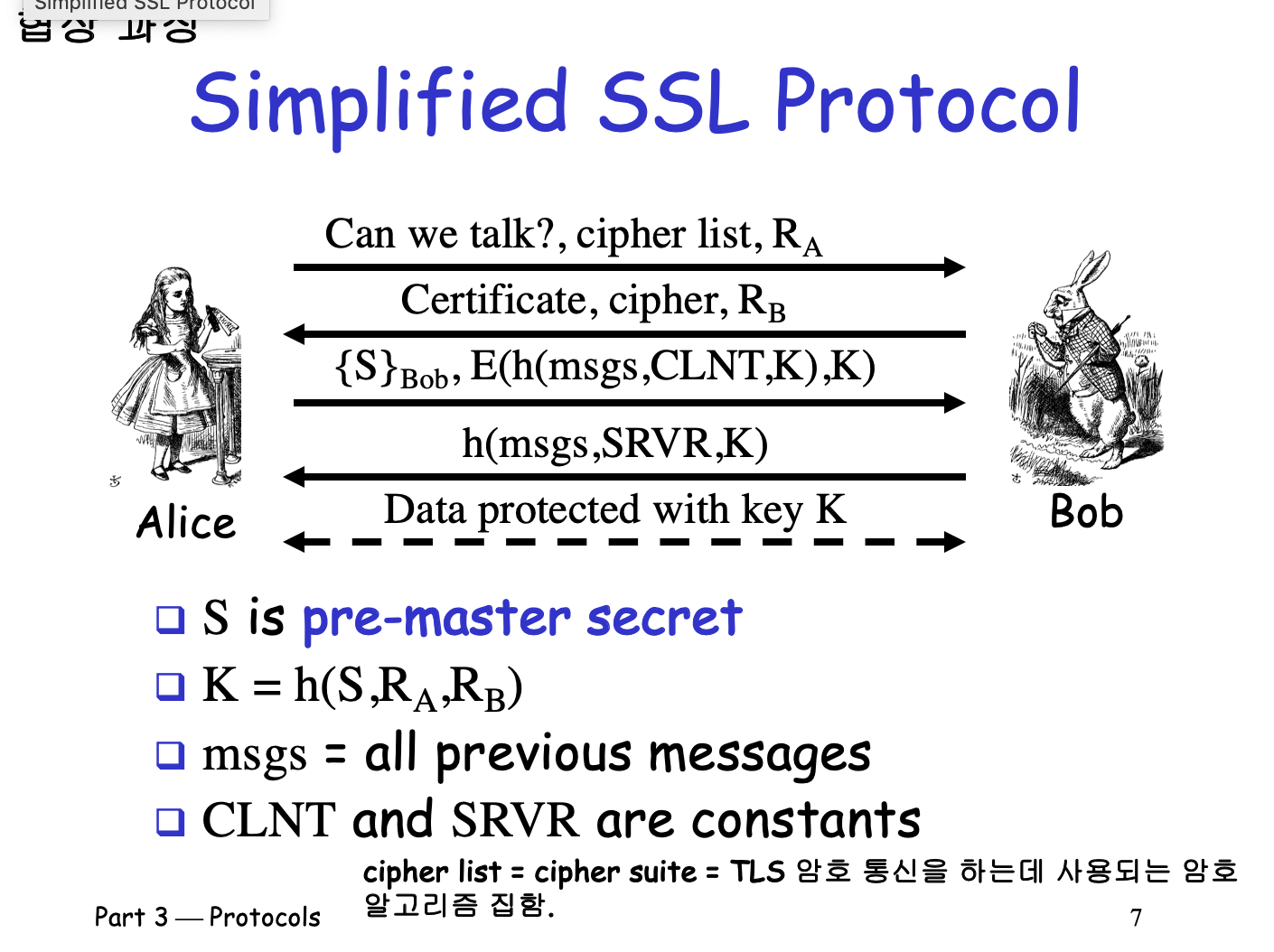 - 이 때 사용할 암호화 기법은 대칭키이므로 pre master secret 키 값은 제 3자에게 절대로 노출되면 안 된다.